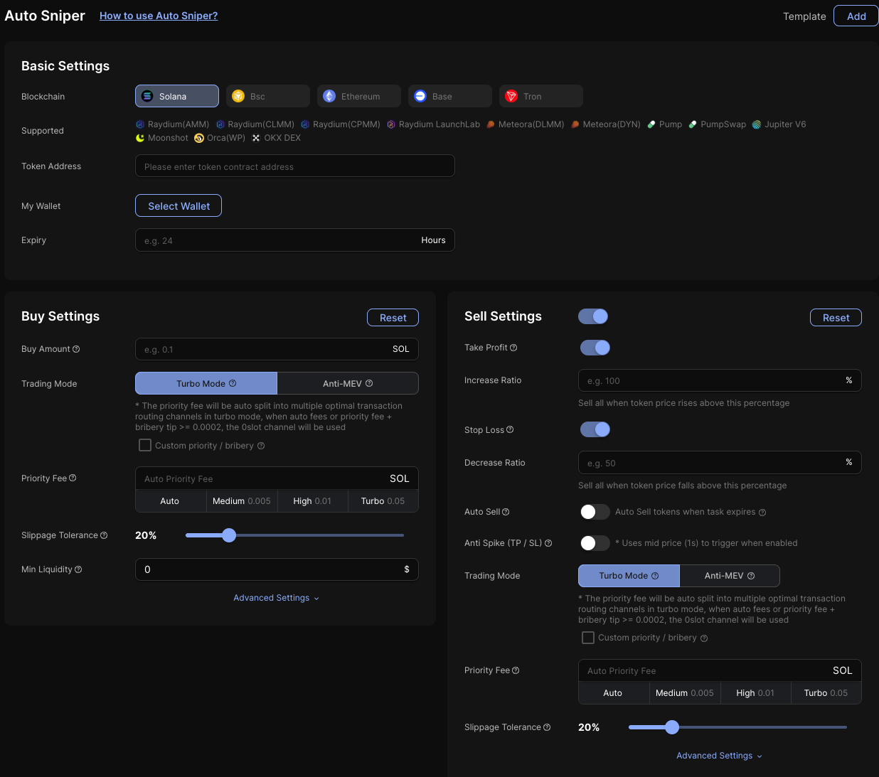 Used to create multi-chain token sniper tasks