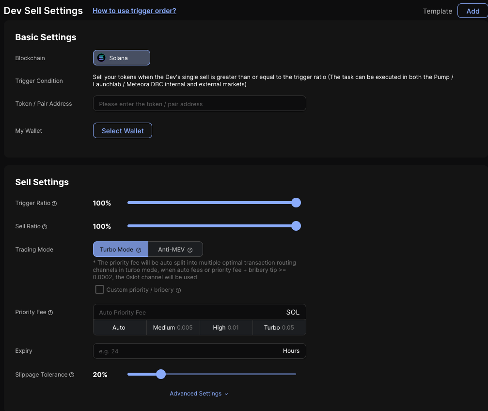 "minDevSellPercent": 0.5, // Trigger ratio (0-1), sell your tokens when Dev sells over this ratio
