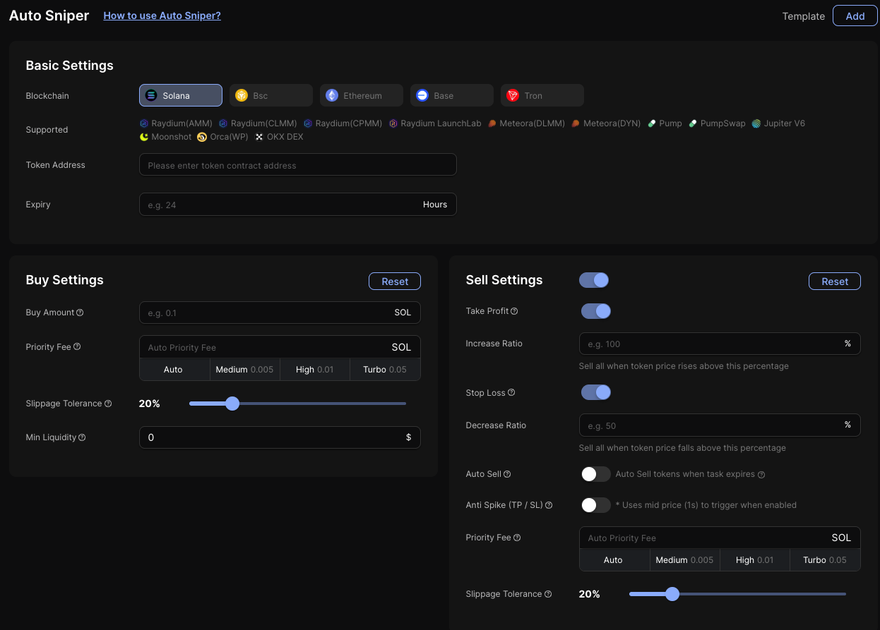 Simulator Auto Sniperpost https://api-bot-v1.dbotx.com/simulator/snipe_orderThis API is used to create multi-chain token sniper tasks in simulatorFreePlusProEnterpriseCredit Usage✅✅✅✅0 Response data JSON{ "err": false, // Error or not "res": { "id": "lus8bfug0040i2" // Order ID } } Request Parameters visualization reference