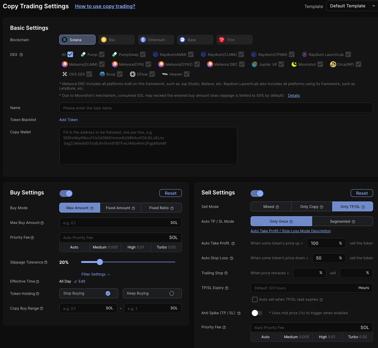 Simulator Copy Tradingpost https://api-bot-v1.dbotx.com/simulator/follow_orderThis API is used to create multi-chain copy trading tasks in simulatorFreePlusProEnterpriseCredit Usage✅✅✅✅0 Response data JSON{ "err": false, // Error or not "res": { "id": "lus8bfug0040i2" // Order ID } } Request Parameters visualization reference