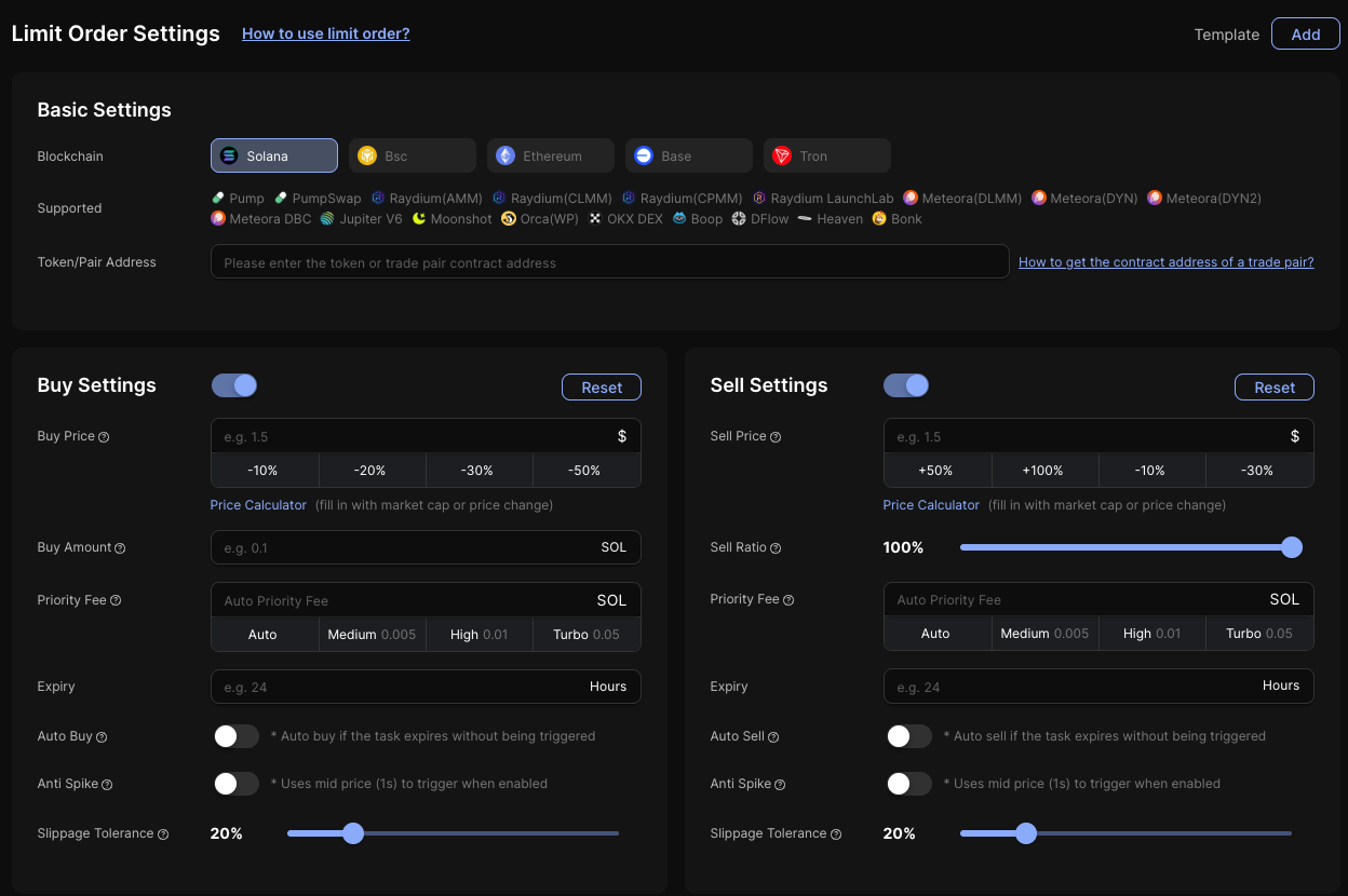 Simulator Limit Orderpost https://api-bot-v1.dbotx.com/simulator/limit_ordersThis API is used to create multi-chain limit buy and limit sell tasks in simulatorFreePlusProEnterpriseCredit Usage✅✅✅✅0 Response data JSON{ "err": false, // Error or not "res": { "ids": [ "lus8bfug0040i2", "lus8bfug004166" // Order ID ] } } Request Parameters visualization reference