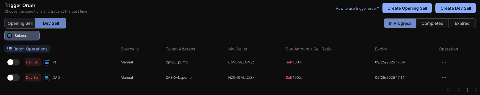 "amountOrPercent": 1, // For buy type, enter buy amount (ETH/SOL/BNB/TRX); for sell type, enter sell ratio (0.00-1.00)