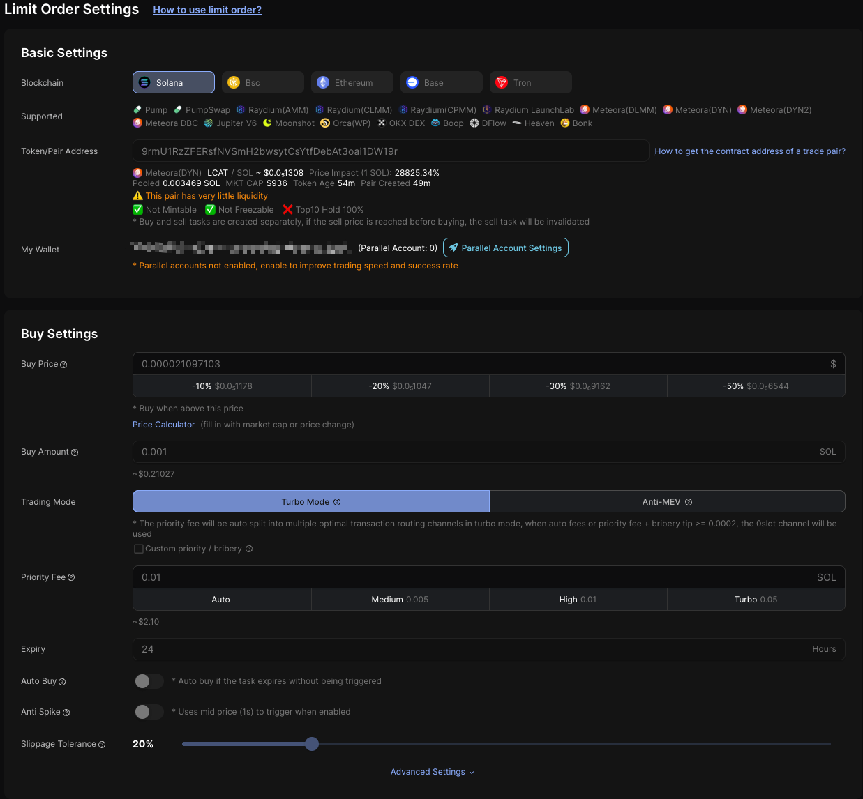 "maxSlippage": 0.1, // MAX slippage tolerance (0.00-1.00), when buying, it represents the difference between the actual price and the expected price. When selling, it represents the difference between the expected price and the actual price, the difference multiplier = 1/(1-slippage), 0.5 means a maximum of 2 times the accepted spread, 1 means unlimited spreads