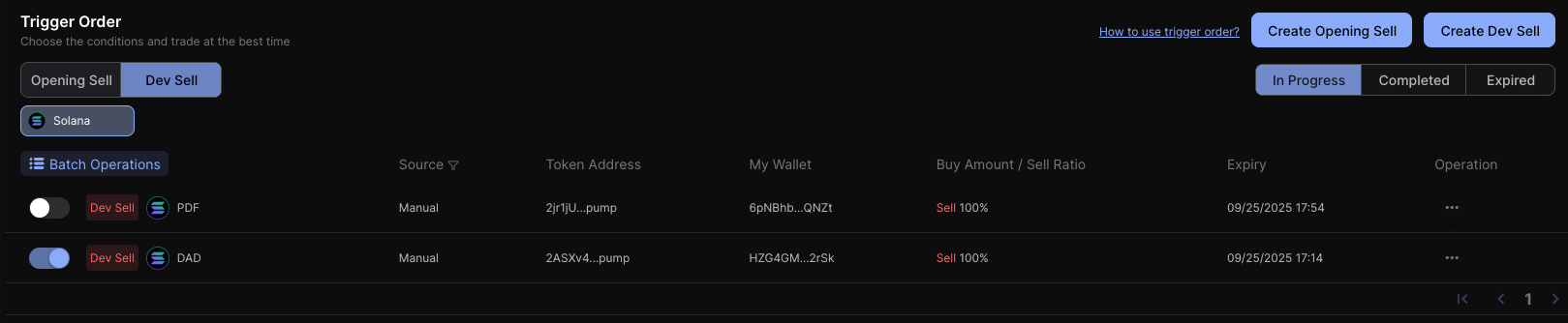 Disable Dev Sellpatch https://api-bot-v1.dbotx.com/automation/dev_orderThis API is used to enable / disable a Dev sell taskFreePlusProEnterpriseCredit Usage✅✅✅✅0 Response Data JSON{ "err": false, // Error or not "res": "" // Response data } Request Parameters visualization reference