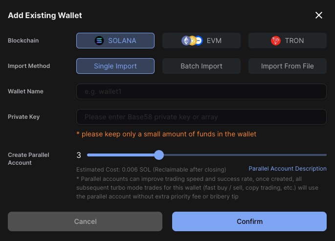 This API is used to import a single solana/evm wallet (please keep only a small amount of funds)