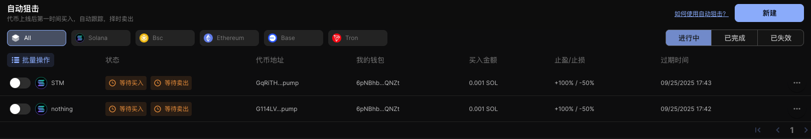 "buyAmountUI": 0.001, // 用于狙击的金额(ETH/SOL/BNB/TRX)