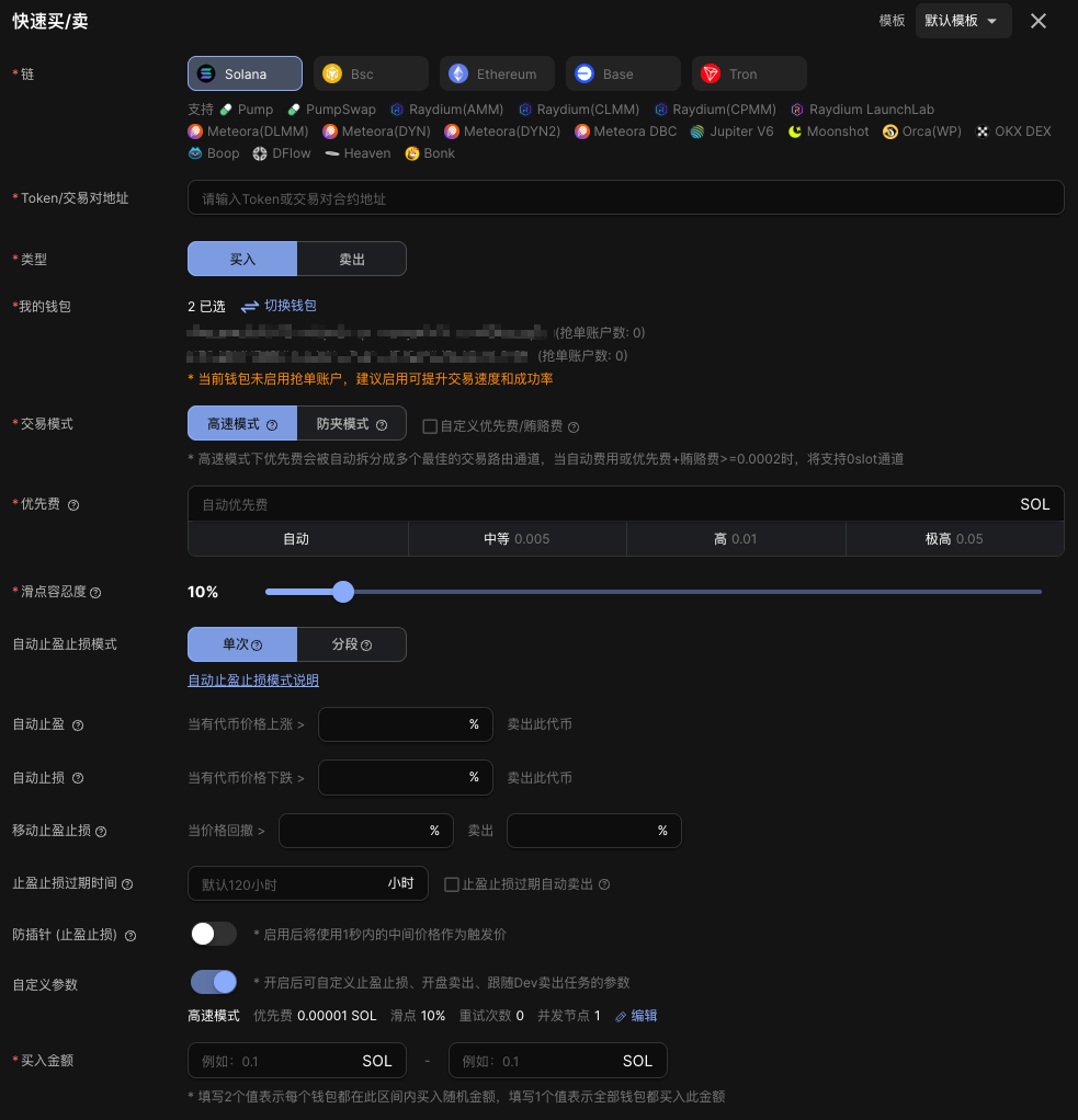 多钱包快速买卖post https://api-bot-v1.dbotx.com/automation/swap_orders_with_multi_wallets此API用于同时使用多个钱包进行快速买入和卖出FreePlusProEnterprise积分消耗✅✅✅✅0 响应数据 JSON{ "err": false, // 是否发生错误 "res": { "ids": [ // 订单id "lus8bfug0040i2", "lus8bfug004166" ] } } 请求参数可视化参考