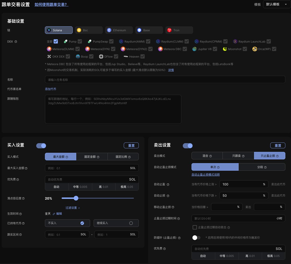 模拟器跟单交易post https://api-bot-v1.dbotx.com/simulator/follow_order此API用于创建模拟器的多链跟单交易任务PlusProFreeEnterprise积分消耗✅✅✅✅0 响应数据 JSON{ "err": false, // 是否发生错误 "res": { "id": "lus8bfug0040i2" // 订单id } } 请求参数可视化参考