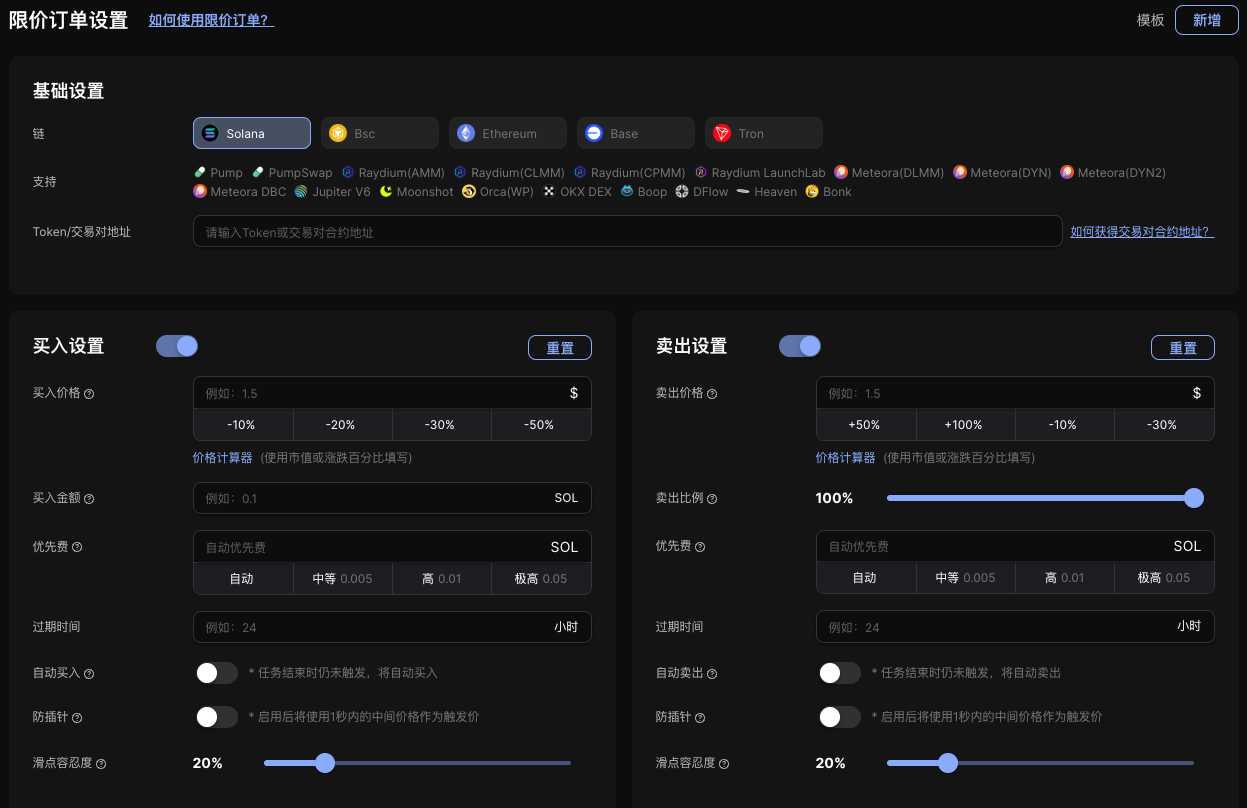 模拟器限价订单post https://api-bot-v1.dbotx.com/simulator/limit_orders此API用于创建模拟器的多链限价买入和限价卖出任务PlusProFreeEnterprise积分消耗✅✅✅✅0 响应数据 JSON{ "err": false, // 是否发生错误 "res": { "ids": [ // 订单id "lus8bfug0040i2", "lus8bfug004166" ] } } 请求参数可视化参考