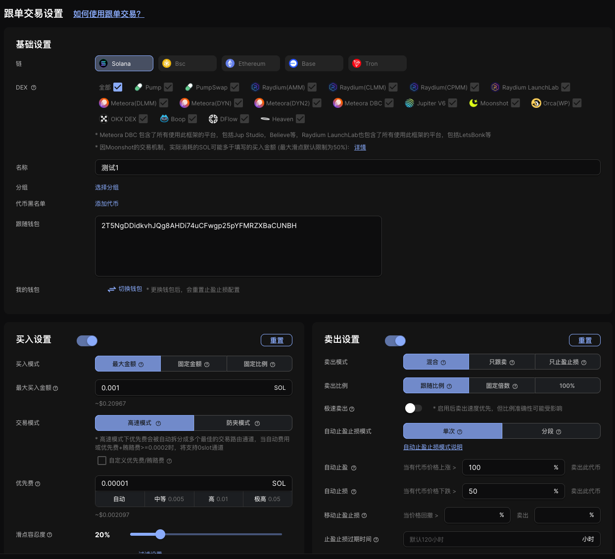 "devSellPercent": 1, // 当跟随Dev卖出任务触发时,你卖出的比例,为0表示不创建跟随Dev卖出任务