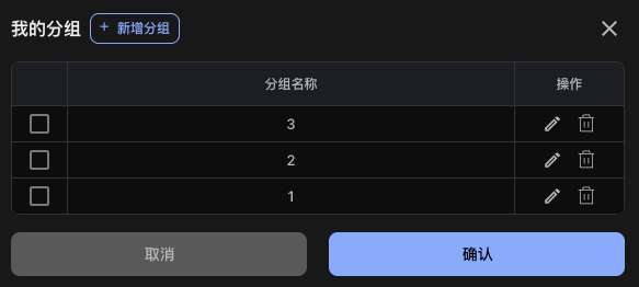 获取分组信息get https://api-bot-v1.dbotx.com/automation/groups此API用于获取跟单或限价单的分组信息FreePlusProEnterprise积分消耗✅✅✅✅0 响应数据 JSON{ "err": false, // 是否出错 "res": [ { "id": "m53gevri055ird", // 分组id "accountid": "vd1l2ge6ac1dxh", // 用户id "name": "group1", // 分组名称 "type": "follow_order", // 分组类型 "createAt": "1732932000000", // 分组创建时间 "updateAt": "1732932000000" // 分组更新时间 } ] } 响应数据可视化参考