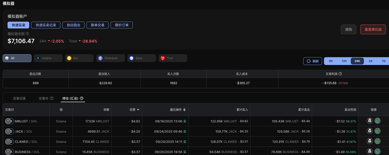 模拟器账户信息get https://api-bot-v1.dbotx.com/simulator/sim_account此API用于获取模拟器账户余额、盈亏等信息PlusProFreeEnterprise积分消耗✅✅✅✅0 响应数据 JSON{ "err": false, // 是否发生错误 "res": { "balance": "15645.23", // 模拟器账户余额 "change24h": 0.152364, // 模拟器账户余额24小时涨跌幅度 "changeAll": 0.564523, // 模拟器账户余额涨跌幅度 "holdTokens": 15 // 模拟器持有的代币数量 } } 响应数据可视化参考