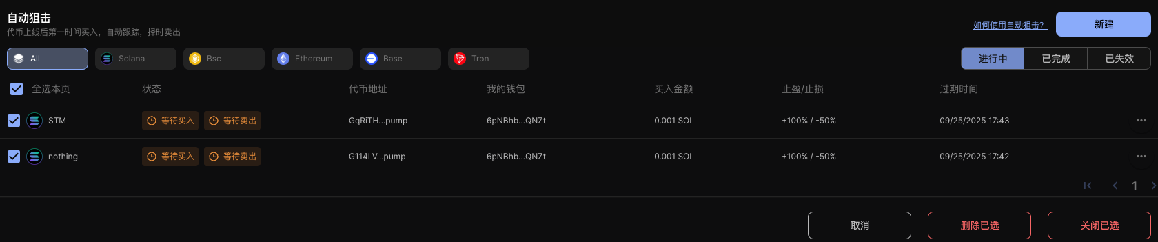 批量开/关自动狙击patch https://api-bot-v1.dbotx.com/automation/snipe_orders此API用于批量启用/禁用指定的自动狙击任务FreePlusProEnterprise积分消耗✅✅✅✅0 响应数据 JSON{ "err": false, // 是否发生错误 "res": "" // 响应结果 } 请求参数可视化参考